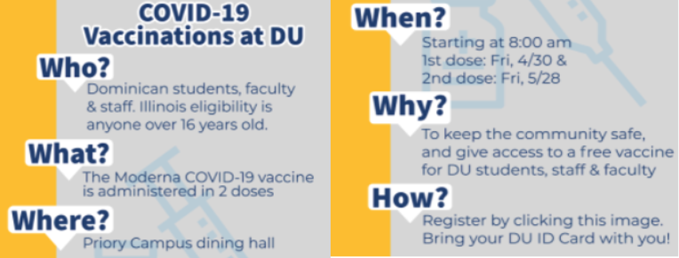 By Chelsea Zhao Dominican University partners with Loop Medical Center for a Moderna vaccination opportunity to DU community. The vaccination is for students, faculty and staff over 16 years old.…